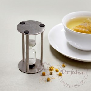 Luxurious hourglass, a stainless steel frame and a glass tube, set for 3 minutes